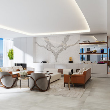 Living room - mid-sized contemporary open concept marble floor living room idea in Miami with white walls and a wall-mounted tv